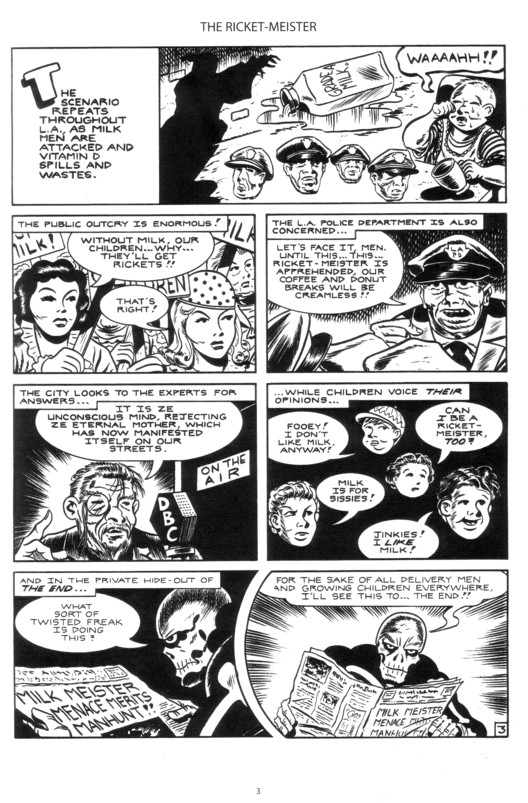 And here I thought I was getting a new Michael Neno comic. Well, technically I am (he has the first story in this collection), but there's much more to this than just one story. Before I get started, click on that website above. There's a cover collection there, and if that isn't the sort of thing that you like, you'll know it instantly. These books are basically new versions of silver age comics, with the occasional wackiness thrown in, but they're basically faithful versions of that type of story with some funny thrown in. First up is the story by Michael Neno, which just so happens to be the cover story. Well, this cover story anyway, there's also an excellent back cover. Someone is attacking all the milk men and none of the children are getting their milk, so an enigmatic hero called The End decides to help them out by going undercover. Yes, you will find many puns about spilt milk, and yes, "The End" is used as a pun more than once. It's still a thoroughly entertaining story. Next up is The Day of the Ice Menace by Johnny Ortiz, Dan Beltran and Mark Prudeax, dealing with an Iron Man-ish character trying to stop a mysterious ball of energy. He touches the ball, which quickly encases him in a block of cosmic ice, but manages to fly to a nearby volcano to get out of it. This story captures the feel of those old stories perfectly as the hero flits from catastrophe to catastrophe before the shocking ending. Finally there's Let Them Be Damned by the same crew of Ortiz, Beltran and Prudeax, which deals with a depressed Santa (after Satan has taken over his job) trying to get his fighting spirit back with the help of Rudolph. More mayhem and I particularly enjoyed the "to be continued" ending, knowing that it probably won't ever be continued unless this is part of a much larger Santa storyline that I missed by not getting the earlier issues. All of this is wrapped up by a text piece from Dan Beltran, which was entertaining enough even if it felt slightly out of place alongside all the illustrated shenanigans. Finally there are a few pin-ups and fake ads, and you're left with a thoroughly entertaining fake silver age comic. Like I said, you already know if this sort of thing, done well, is something you'd enjoy. This is done extremely well, so it's your call. And it's cheap! $1.95