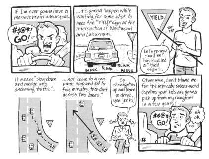 Well, whatever else I can say about running this website for almost 8 years, it has succeeded in one of my more selfish goals: getting free comics from some of my favorite creators. That's right suckers, you all thought I was promoting small press work, trying to spread the word about all the talent out there, when all I was doing was secretly trying to find a way to stop paying for comics. Once I break through to the fancypants at Fantagraphics and Drawn & Top Shelf my plan will be a complete success! Ahem. This comic reprints a weekly local strip Rob does (which you can find here), and these things should be much more common than they are. Rob talks about his beloved Pittsburgh teams, his annoyances with traffic, buying crappy Christmas lights, the rising price of food versus the lowering price of gas, getting great seats at a Cub's game, a broken caller I.D., cheap lousy haircuts, getting a bit too much into football games, a perfect day with the family, almost mowing the lawn for a lazy neighbor and finding out that his small child actually travels quite well. It cheapens the strips to put them all in bullet point form like that, as Rob has always had a keen eye for pointing out the little things in life, and is probably at his best detailing these quiet little moments of family life. Here's hoping he keeps that weekly strip in an economy where many papers are slashing their comics section (often their cheapest and most viewed section, but nobody ever accused current newspaper executives of being good business people), as there's some great stuff in this little collection. I'm not seeing this on his website (but if he didn't have any copies available he probably wouldn't have sent one to me), but here's guessing that it's, oh, $2.50