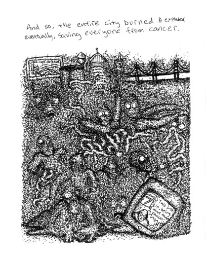Important note: I have a fairly miserable cold today, my head feels like it's going to float away and I mostly want to go back to bed. So if this review comes across as crankier than usual, it may or may not be justified. That's what I get for pledging to keep up the daily reviews. I should also note that this issue came out in 2005 and my main complaints (the overwhelming amount of shading in the action scenes and the many spelling errors) seem to have been fixed, or at least that's the impression I got from wandering around Jose's website for a bit. Still, this review is about this particular issue, and it landed on the side of being a bit of a disappointment. Mostly because Jose set a high bar for himself initially (at least with me), as there aren't nearly enough people doing political and/or current events in their comics. This mini has a pile of stories, starting with a meandering piece about the benefits of abandoning society and joining a group of people living in the wilderness. It did make a few good points. I would think one of the main points of leaving society would be to leave other people altogether, but I'm also an antisocial kind of guy. Next up is a short piece with a hippy arguing that we should respect all cultures, including the ones that practice genital mutilation. Said hippy goes on to practice what he preaches, but the story would have probably been stronger without the final page of generic hippy bashing. They're an easy target, I know, but sometimes less is more. Cancer Everywhere is the funniest piece in the book, dealing with the fact that everything in the world supposedly causes cancer and the creative ways the people involved try to work their way around that fact. Still, I used a sample page from this story to illustrate my point about that art going shade crazy. Philanthopy Massacre also deals with fairly easy targets: the Hollywood elite and the criminal amount of money wasted on crappy movies when it could go to helping all sorts of people. A massacre is always fun and there are some insightful bits, so no complaints there. Finally there's a piece about how everything is so shitty and how much shittier it's going to get in ten years, and you're certain to find something to agree with in this one. All told it's a meh, mostly because of the dense shadowing whenever things got really interesting, the spelling errors (although he did get a lot of the big words right, so it's not like the guy's a moron), and his unfortunate habit of calling every stupid thing "gay". I did like how he summed up the stories in the introduction, or at least what he was trying to accomplish with them. From his website it's hard to tell if he's still doing comics, but (yes, even with the "meh" review) I'd like to see where these stories went from here. No price, but it's probably around $2.