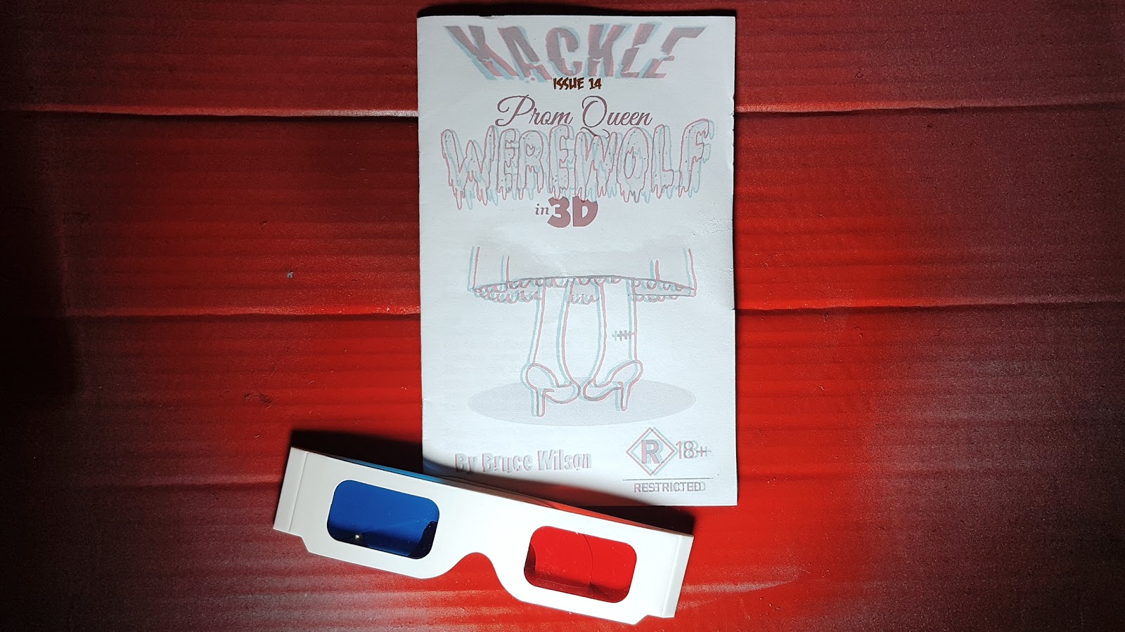 Kackle #14 is well executed and produced, for example even the 3D spectacles are attached in a way that facilitates the zine to dispense with an unnecessary envelope for shipping. It's a small point, and I know paper is fundamental to our medium, but we should all be conserving where we can.